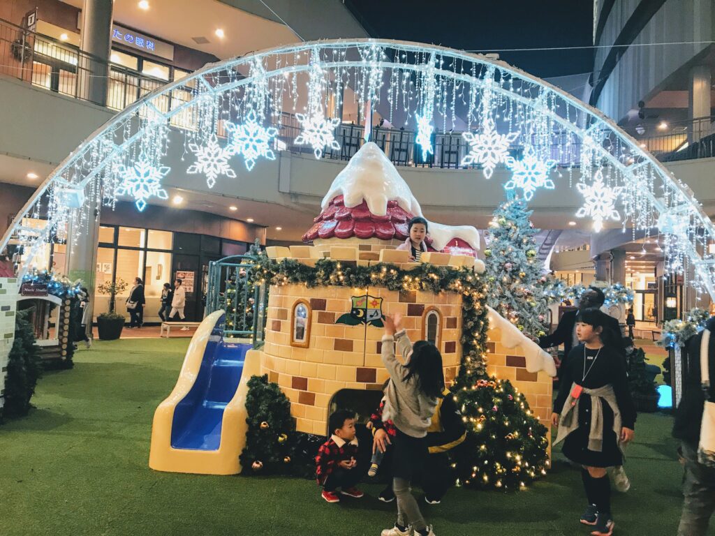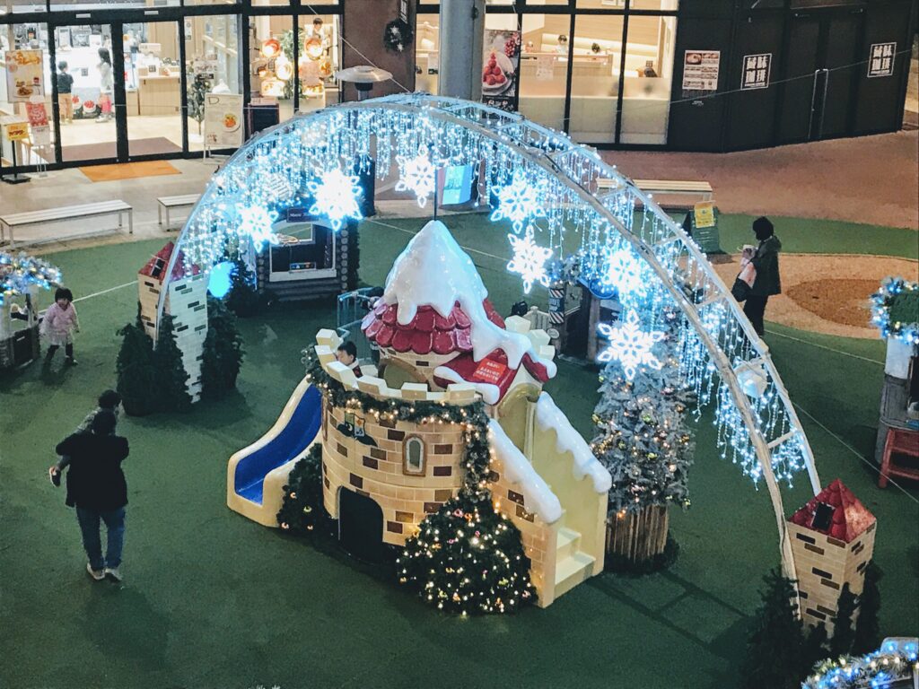 普段は小さめの遊具が揃っている、木の葉モールの大広場遊具ですが、この時期(12月〜1月)になると、イルミネーションで飾られたキラキラ遊具が登場します。