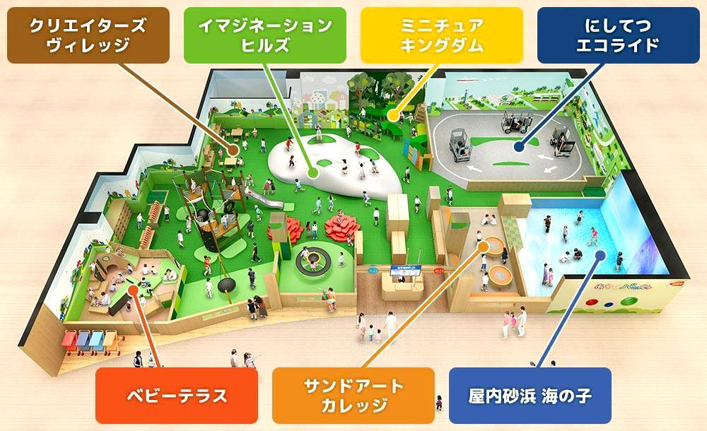 お座りができる生後半年〜12歳(小学6年生)までの子供がのびのびと遊べるようにさまざまなテラスが分けられています。