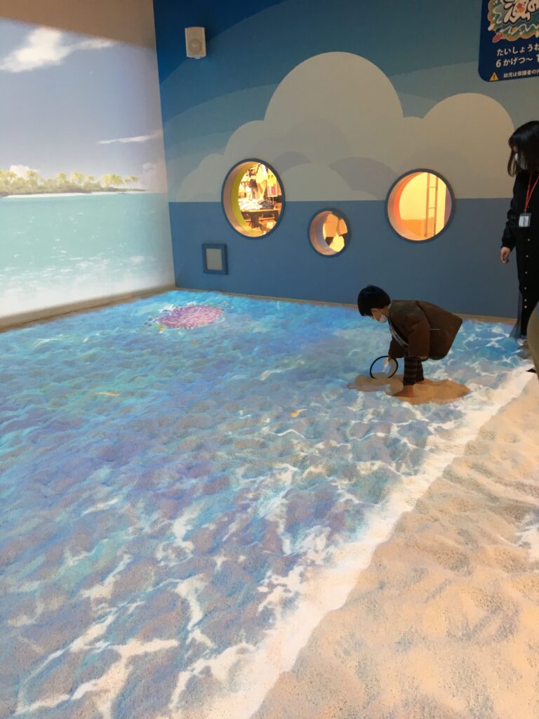 海の中にいるような投影がされており、身体に優しい砂でできた屋内砂場「屋内砂浜 海の子」は、あそびパークPLUSの中でも一番人気の遊び場です。
